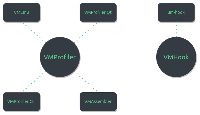 Although there may seem to be quite a handful of projects located at githacks.org/vmp2, there is really only a single large library project and smaller projects which inherit this library. VMProfiler is the base library for VMProfiler Qt, VMProfiler CLI, VMEmu, and VMAssembler. Each of these projects are static analysis based and thus VMHook and um-hook do not inherit VMProfiler.