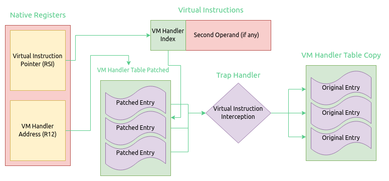 VMHook is a very small C++ framework for hooking into VMProtect 2 virtual machines, um-hook inherits this framework and provides a demonstration of how to use the framework. VMHook is not used to uncover virtual instructions and their functionality, rather to alter them.