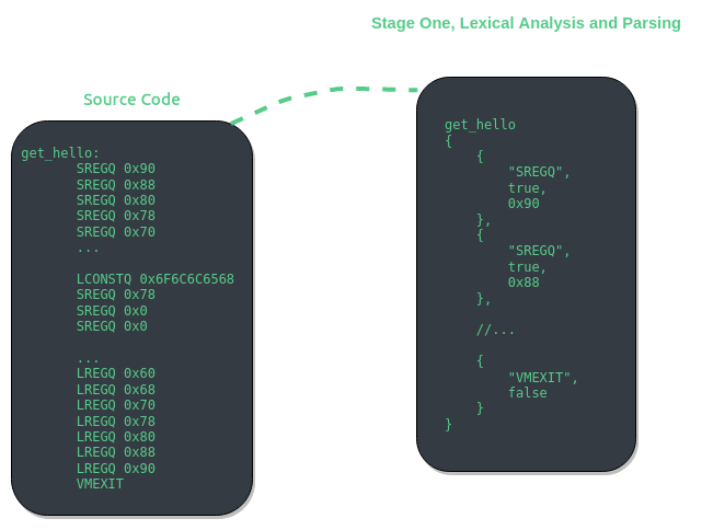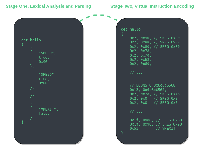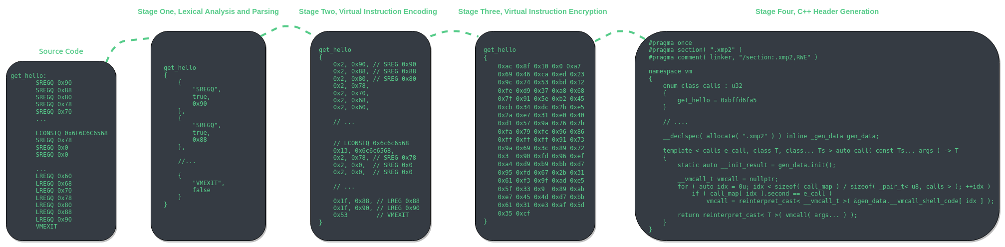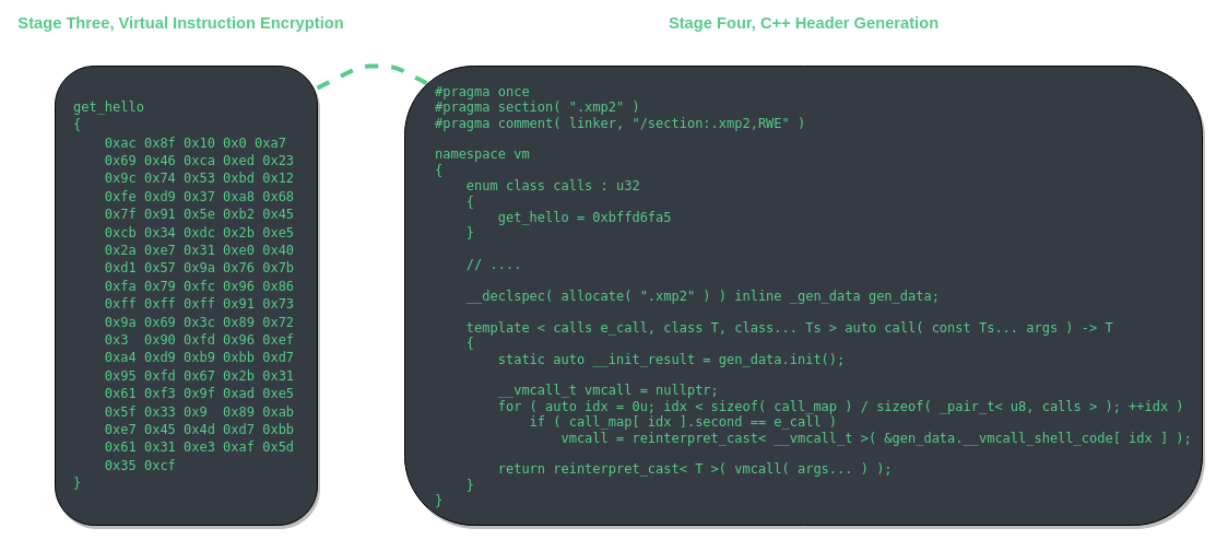 Stage four is the final stage of virtual instruction assembly. In this stage C++ code is generated. The code is completely self contained and environment agnostic. However, there are a few limitations to the current implementation. Most glaring is the need for a RWX (read, write, and executable) section. If one were to use this generated C++ code in a Windows kernel driver then the driver would not support HVCI systems. Also, as of 6/19/2021, MSVC cannot compile the generated header as for whatever reason, the static initializer for the raw module causes the compiler to hang. You must use clang-cl if you want to compile with the generated header file from VMAssembler.