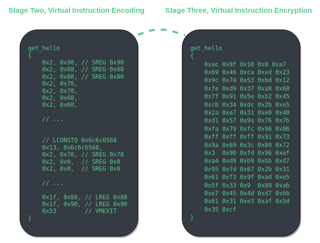 This stage will do $F^{-1}(e, o)$ and $G^{-1}(e, o)$ for each virtual instruction operand of each label. Lastly, the relative virtual address from vm_entry to the first operand of the first virtual instruction is calculated and then encrypted using the inverse transformations used to decrypt the relative virtual address to the virtual instructions themselves. You can find more details about these transformations inside of the vm_entry section of the last article.