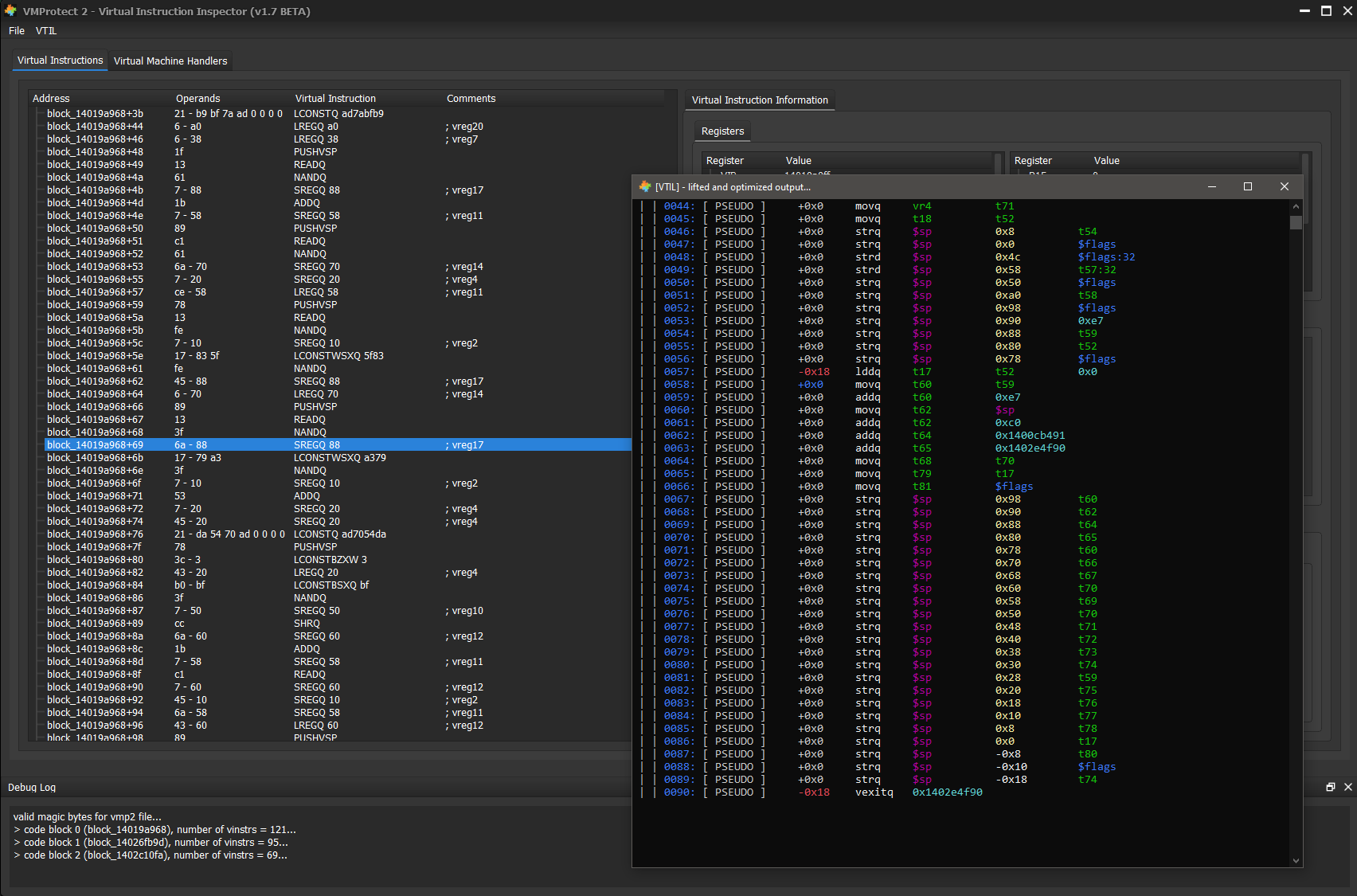 Additionally, devirtualization requires converting back to native x86_64. In order to do this, every single virtual machine handler must be profiled, every single virtual machine handler must have a VTIL lifter defined for it, and every single VTIL instruction must be mapped to a native instruction. At least this is what seems to be required with the level of knowledge I currently have, there may well be a much more elegant way of going about this that I am simply oblivious to at this time. Thus my conclusion to devirtualization: it is not a job for a single person, thus the goal of my project(s) has never been devirtualization, it’s always been an IL view of the virtual instructions with VTIL providing deobfuscation pseudo code. The IL alone is enough for a dedicated individual to begin research, the VTIL pseudo code makes it easier for the rest of us. VMProfiler Qt combined with IDA Pro as it currently exists can be used to analyze binaries protected with VMProtect 2. It may not be a beginner friendly solution, but in my opinion, it will suffice.