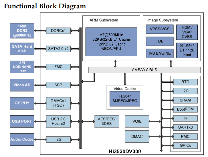 ”Hi3520D V300 is a professional SoC targeted for the multi-channel HD (1080p/720p) or SD (D1/960H) DVR. Hi3520D V300 provides an ARM A7 processor, a high-performance H.264 video encoding/decoding engine, a high-performance video/graphics processing engine with various complicated graphics processing algorithms, HDMI/VGA HD outputs, and various peripheral interfaces. These features enable Hi3520D V300 to provide high-performance, high-picture-quality, and low-cost analog HD/SDI solutions for customers’ products while reducing the eBOM cost”