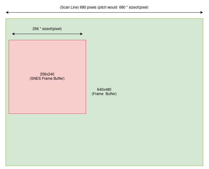 Pixel formatting is also important to understand. The SNES9X emulator uses RGB565 by default, the hisilicon framebuffer device uses ARGB1555 by default and thus a pixel conversion is required. The TDE engine also handles pixel conversion to a certain extent.