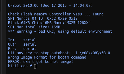 After executing these uboot commands I received nothing out of UART and so I concluded I had flashed the wrong uboot image. There were actually two pre-compiled uboot images in the SDK. I then started working with the SPI NOR flash memory directly using my bus pirate.